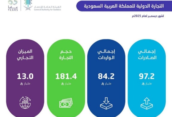 وأظهرت نتائج التجارة الدولية السلعية لشهر ديسمبر 2025 ارتفاع الصادرات السلعية الإجمالية بنسبة 3.0% مقارنة بشهر ديسمبر من عام 2024، وارتفعت الصادرات البترولية بنسبة 1.0%، فيما انخفضت نسبة الصادرات البترولية من إجمالي الصادرات من 68.7% في ديسمبر 2024م إلى 67.4% في ديسمبر 2025م، وعلى صعيد الواردات ارتفعت بنسبة 2.4% خلال الفترة نفسها، في حين سجّل فائض الميزان التجاري نموًا بنسبة 7.1% مقارنة بشهر ديسمبر من العام السابق.